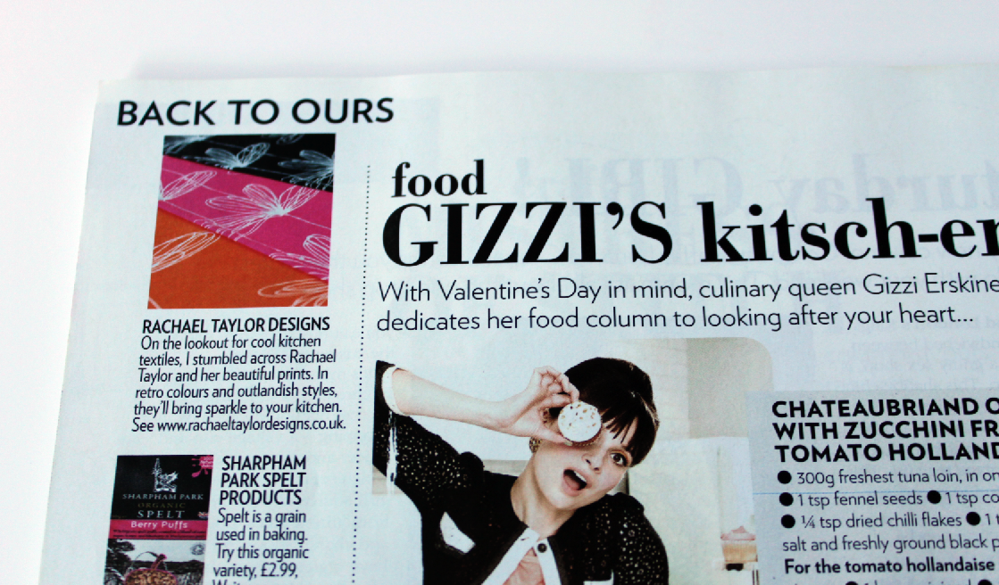 Company Magazine Feature! Happy Saturday everyone hope you have a lovely weekend! Today is just a little special one off Saturday post dedicated to the lovely, talented & famous chef Gizzi Erskine as she recently gave my products a lovely feature & write up in her monthly column for Company magazine (Feb 2011 issue) “On the look out for cool kitchen textiles, I stumbled across Rachael Taylor and her beautiful prints. In retro colours & outlandish styles, they’ll bring sparkle to your kitchen”. I’m super chuffed & excited that she likes my work as she’s someone who’s quirky style I really admire. I also love her fun & brightly coloured website! Thank you so much Gizzi x Next Article Previous Article